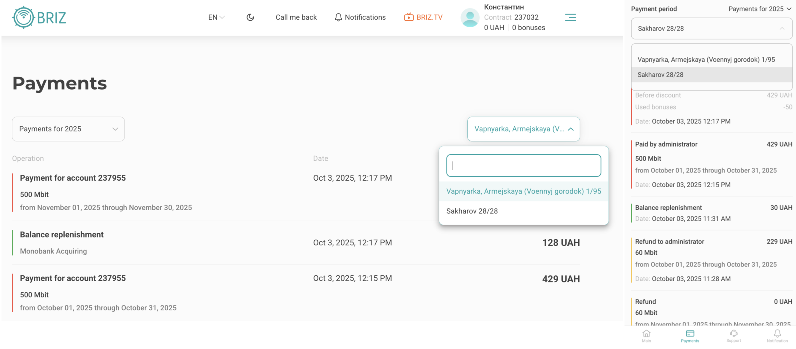 All payments are displayed in the "Payments" section. The administrator sees the history for each child account.