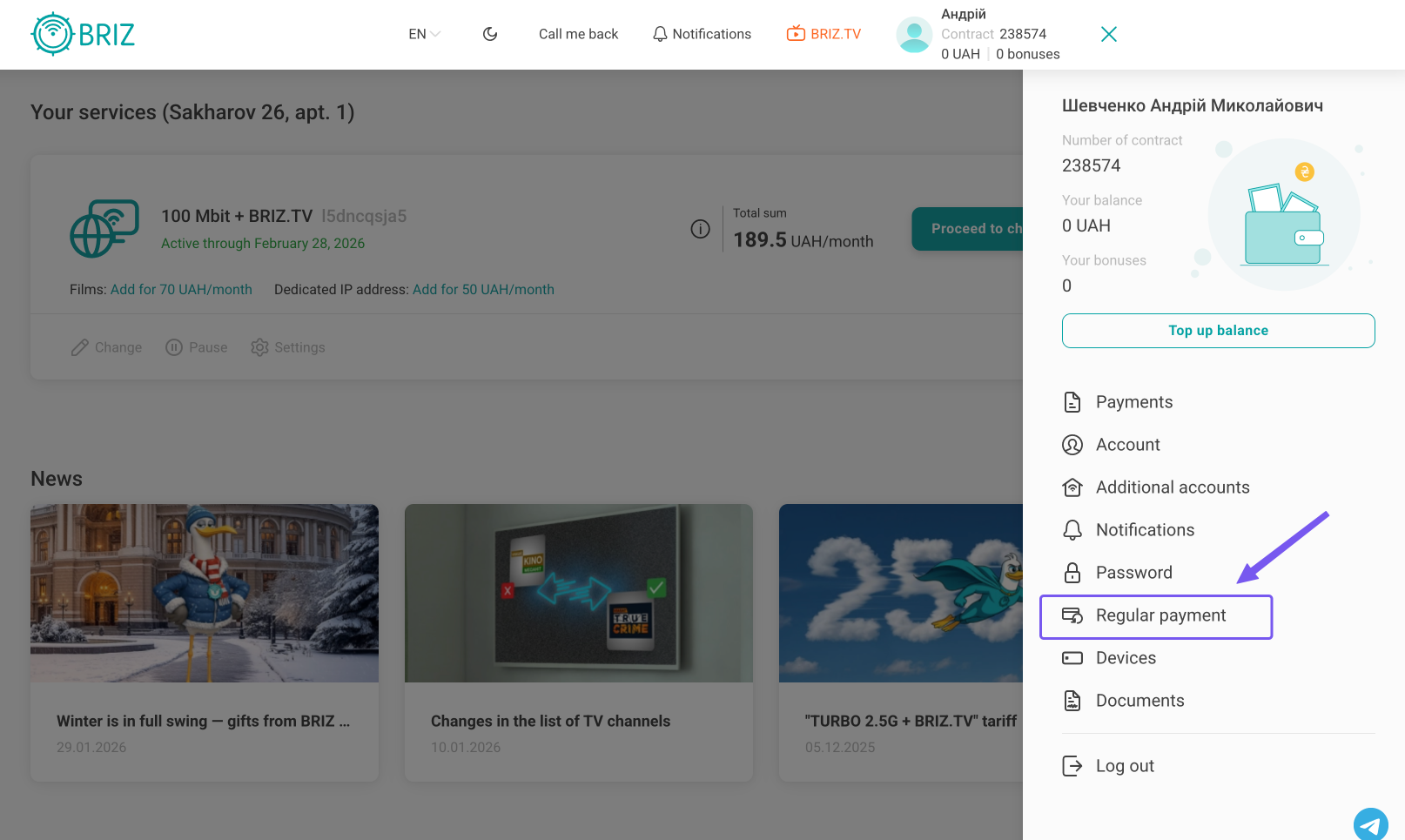 Now you don’t not need to pay for BRIZ services yourself and remember the date of payment. By activating the “Regular payment” service, funds will be debited automatically.