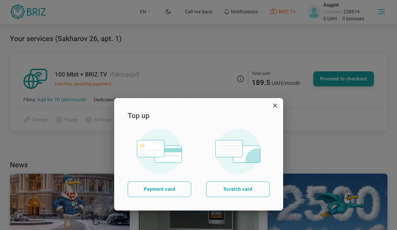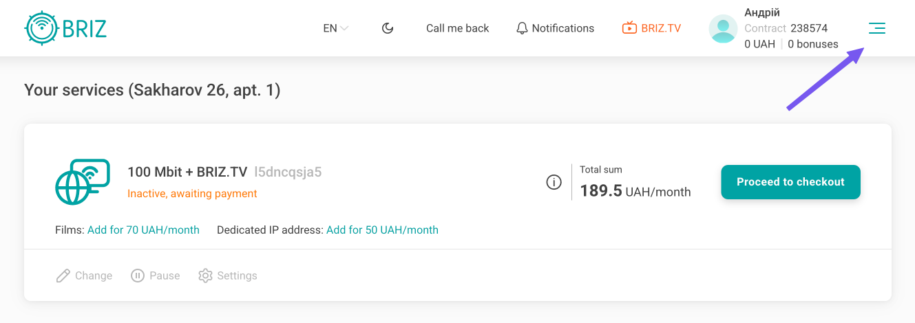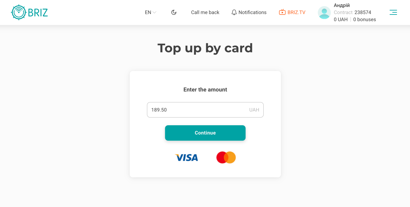 - Log in to your personal account on a website or in My Briz app (OS Android and iOS).