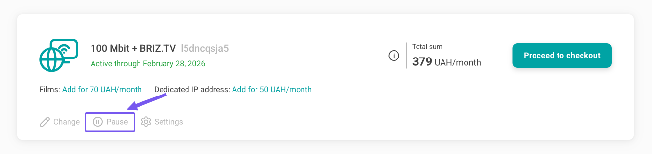 On the main page of your personal account, in the “Your services” block, click “Pause”.