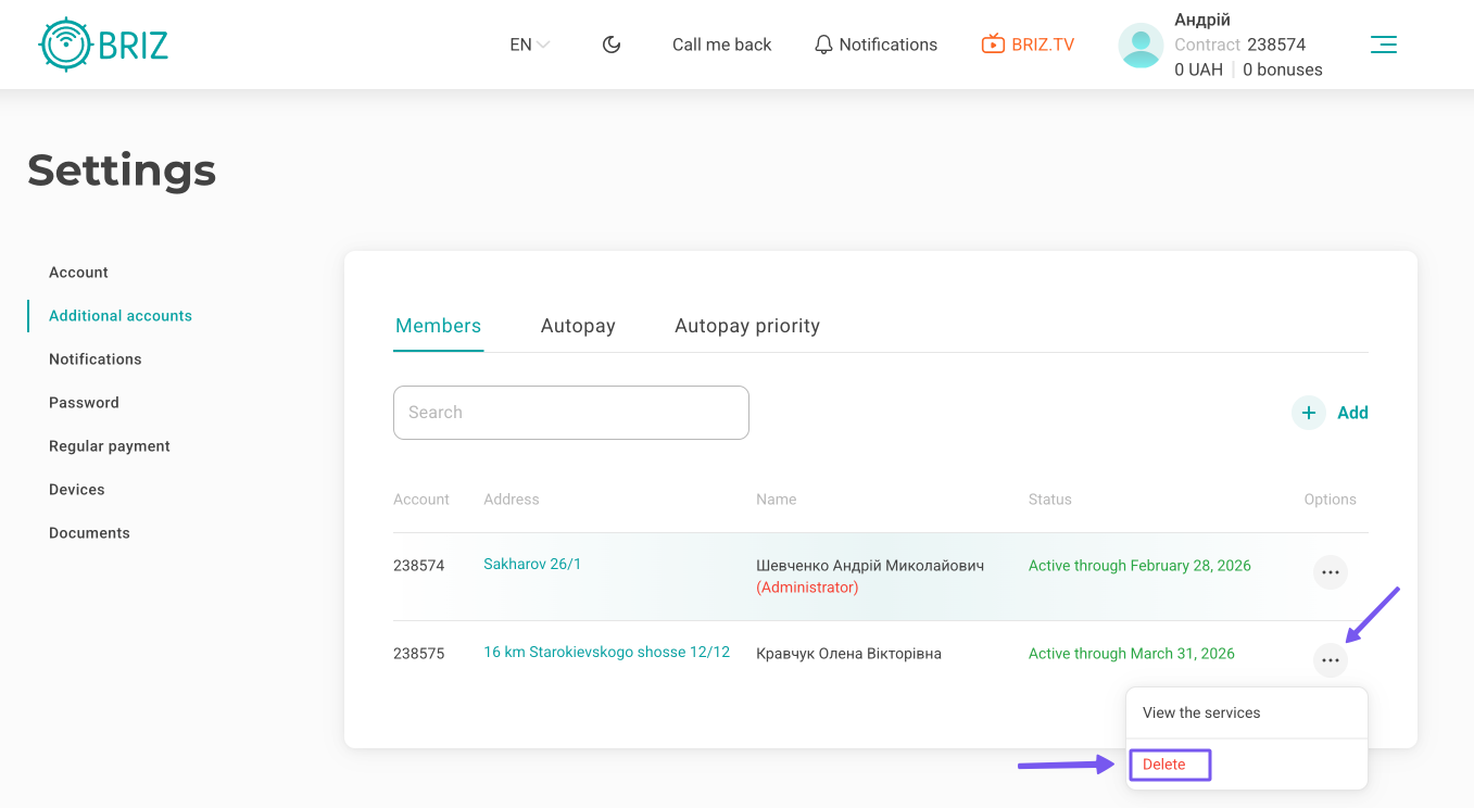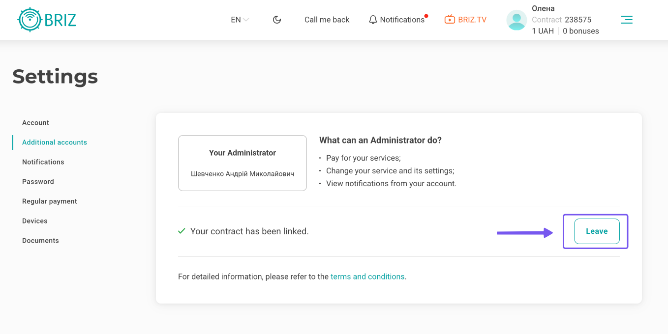 - Click "Delete" to exclude the agreement from the multi-account (the administrator cannot delete his own agreement).