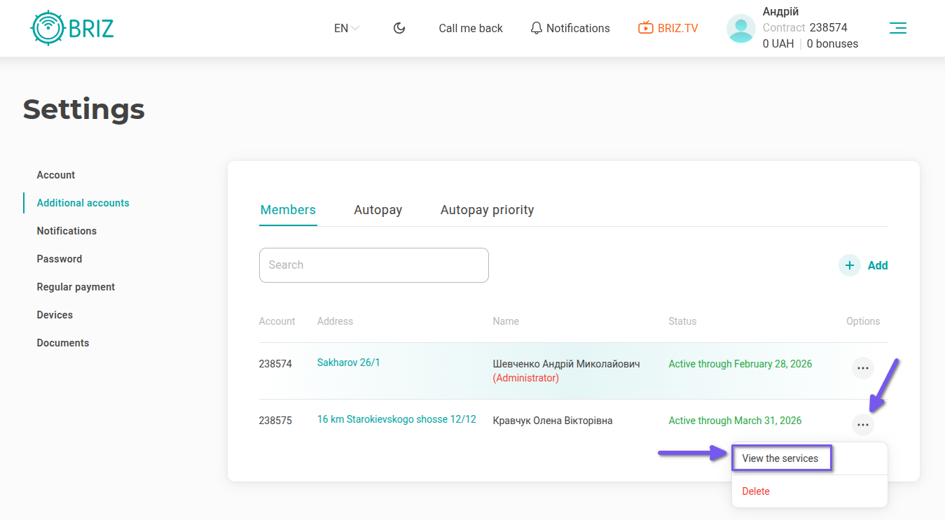 - From the list of subsidiary contracts, select the one you need to pay for and click the three dots opposite it.