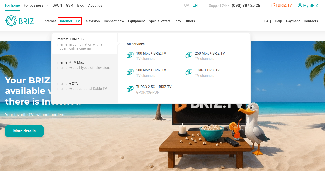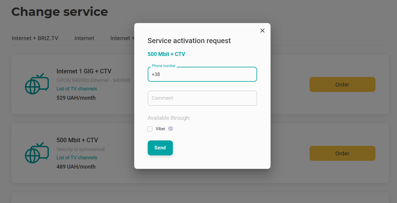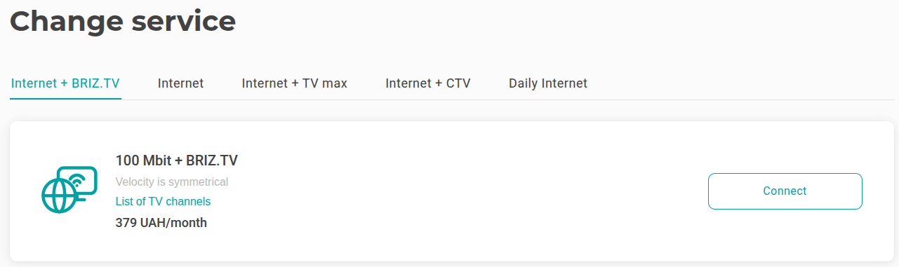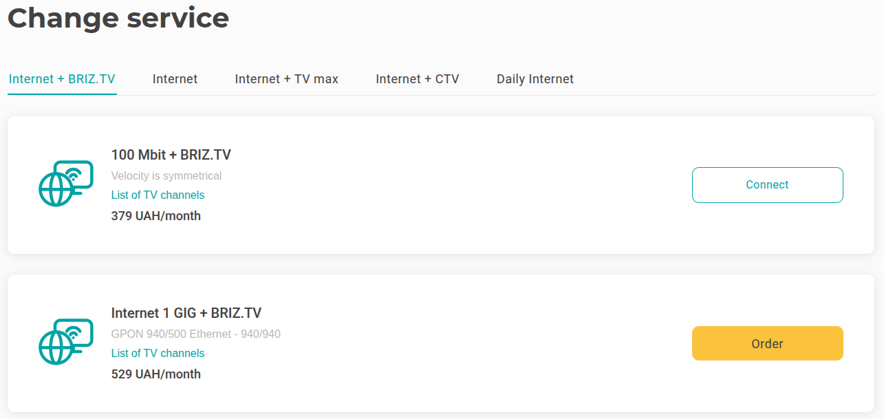 Please note that you can activate only the combined "Internet + BRIZ.TV" tariff through your personal account. If you want to activate the "Internet + CTV" or "Internet + TV max" tariff, you need to contact a support operator.