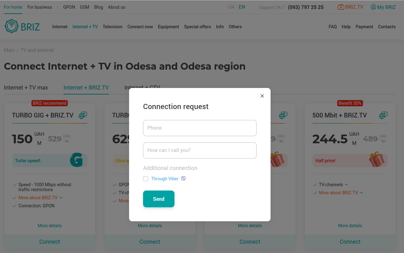 In the "Internet + BRIZ.TV" section, select the tariff that meets your needs and click "Connect" or "Order".