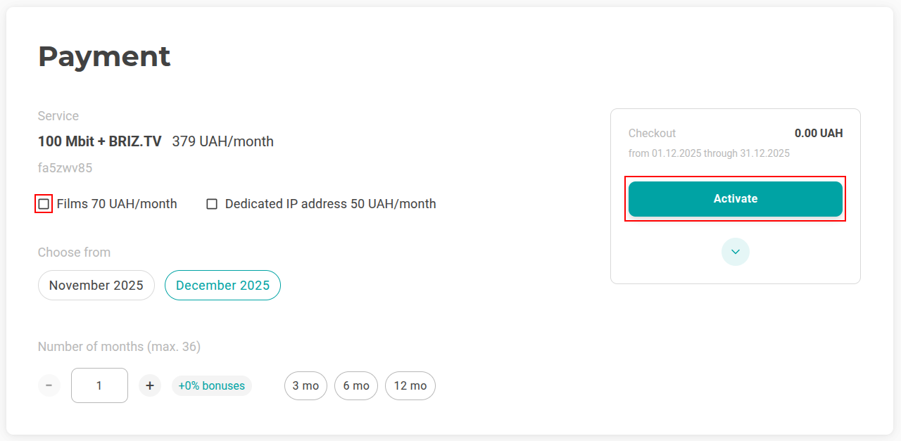 In the "Payment" section, select the number of months you want to pay for the tariff. If you want to activate additional services, such as Movies and Dedicated IP address, check the box next to them and click "Activate".