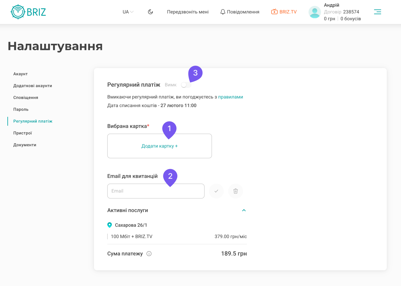 Тепер вам не потрібно самостійно оплачувати послуги BRIZ та пам'ятати про дату платежу. Підключивши послугу “Регулярний платіж”, списання коштів буде виконано автоматично.