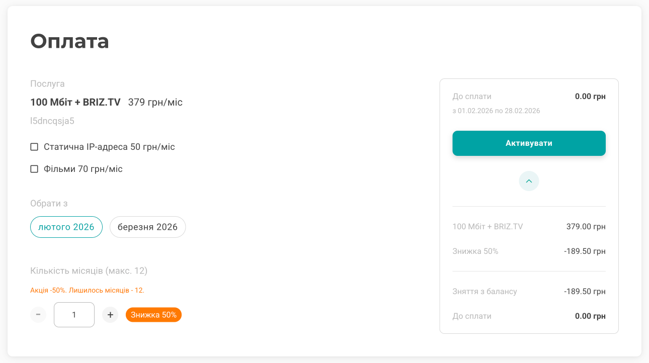 Кнопка "Активувати" буде доступна лише за наявності достатньої суми на балансі для оплати послуг. У разі нестачі коштів для оплати, з'явиться кнопка “Перейти до сплати”.