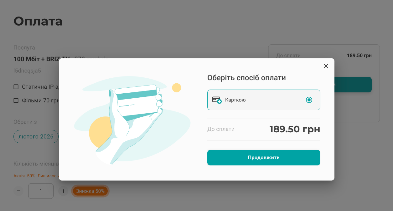 - Якщо на балансі акаунту недостатньо коштів для оплати послуги – у вікні, що відкриється, оберіть спосіб оплати та дотримуйтесь підказок у формі оплати.