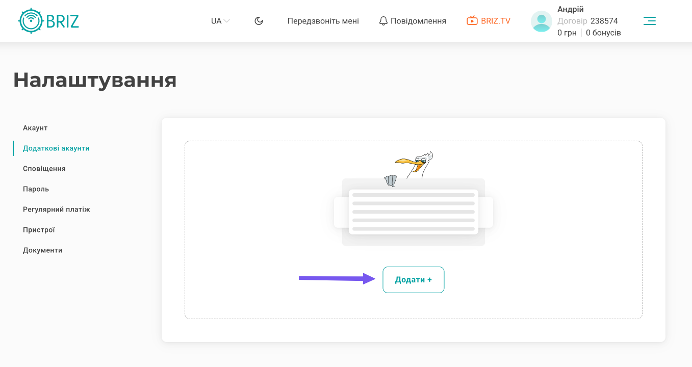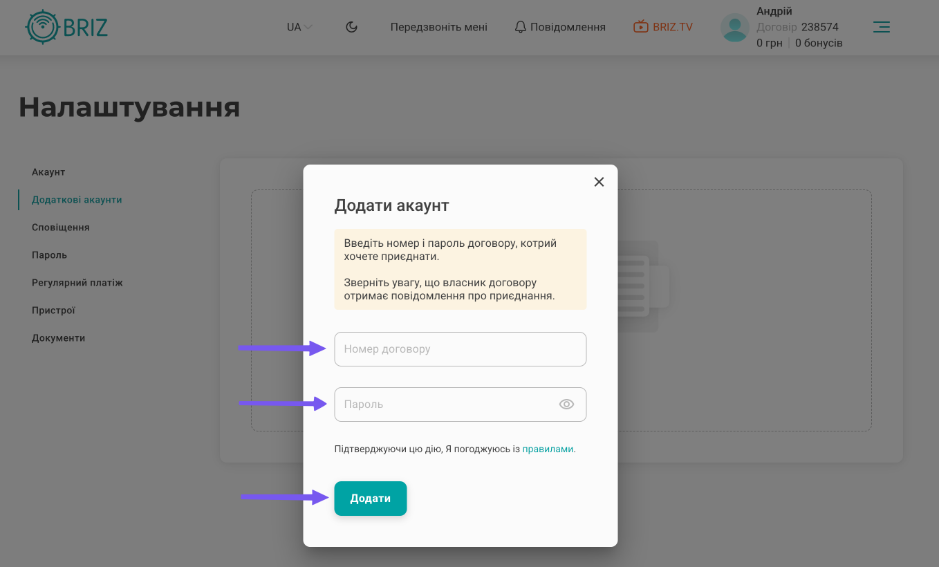 - У формі, що з’явиться, введіть номер і пароль договору, що бажаєте приєднати, потім натисніть «Додати».