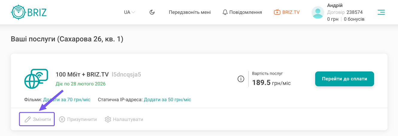 На головній сторінці особистого кабінету в блоці “Ваші послуги” натисніть “Змінити”.