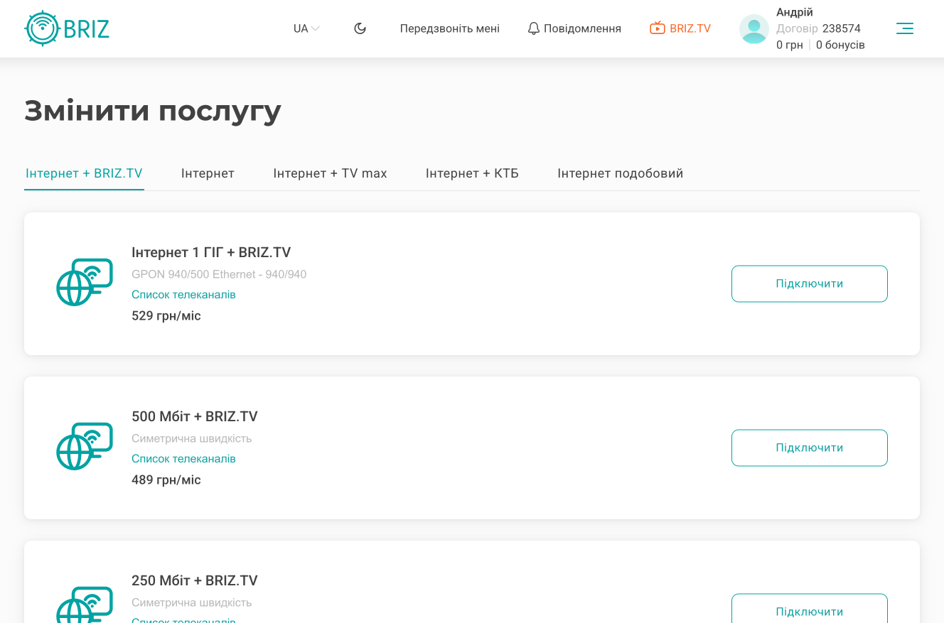 Після чого ви побачите доступні послуги Інтернет і Об'єднані тарифи.