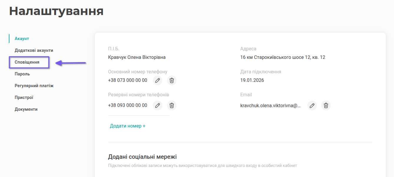 Якщо хочете отримувати повідомлення на іншу пошту або номер телефону, поверніться в налаштування облікового запису та відредагуйте відповідне поле.