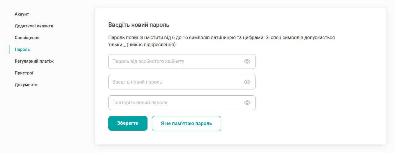 Введіть пароль від особистого кабінету, потім два рази введіть новий пароль. Натисніть кнопку “Зберегти зміни”.