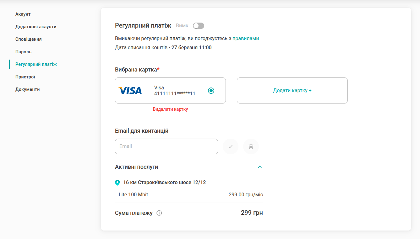 Для цього перейдіть у вкладку “Регулярний платіж” із налаштувань вашого облікового запису.